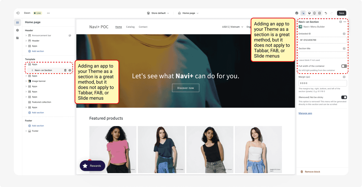 <summary>Can I insert a sticky menu (like a Tabbar or FAB) or a slide menu as a section inside the Theme?</summary>